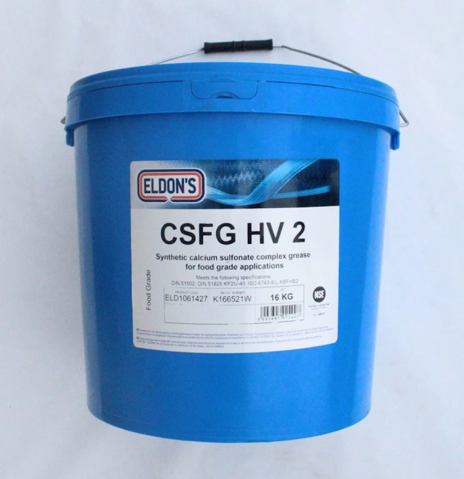 Смазка пищевая CSFG HV 2 производства компании «ELDON'S» Греция – это синтетическая комплексная смазка на основе сульфоната кальция, специально разработанная для строжайших условий эксплуатации, высоких нагрузок, длительных интервалов между заменами смазки, низких скоростей и т.д. Синтетическое масло, используемое в рецептуре (PAO), обеспечивает увеличенный срок службы и диапазон рабочих температур по сравнению с продуктами на основе минерального масла. Благодаря своей особой структуре оно обеспечивает отличную производительность во влажных и мокрых средах и длительный срок службы. Данная смазка обеспечивает защиту и эффективную смазку при высоких температурах, когда другие комплексные смазки не являются эффективными. Это нетоксичный продукт без добавления пигментов.
